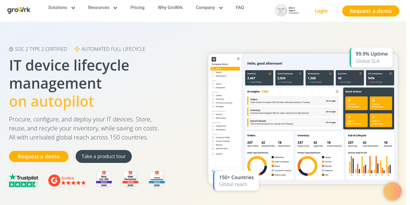 Save time and money managing your distributed team's devices with GroWrk's IT asset management software. Deploy and recover equipment in 150+ countries.